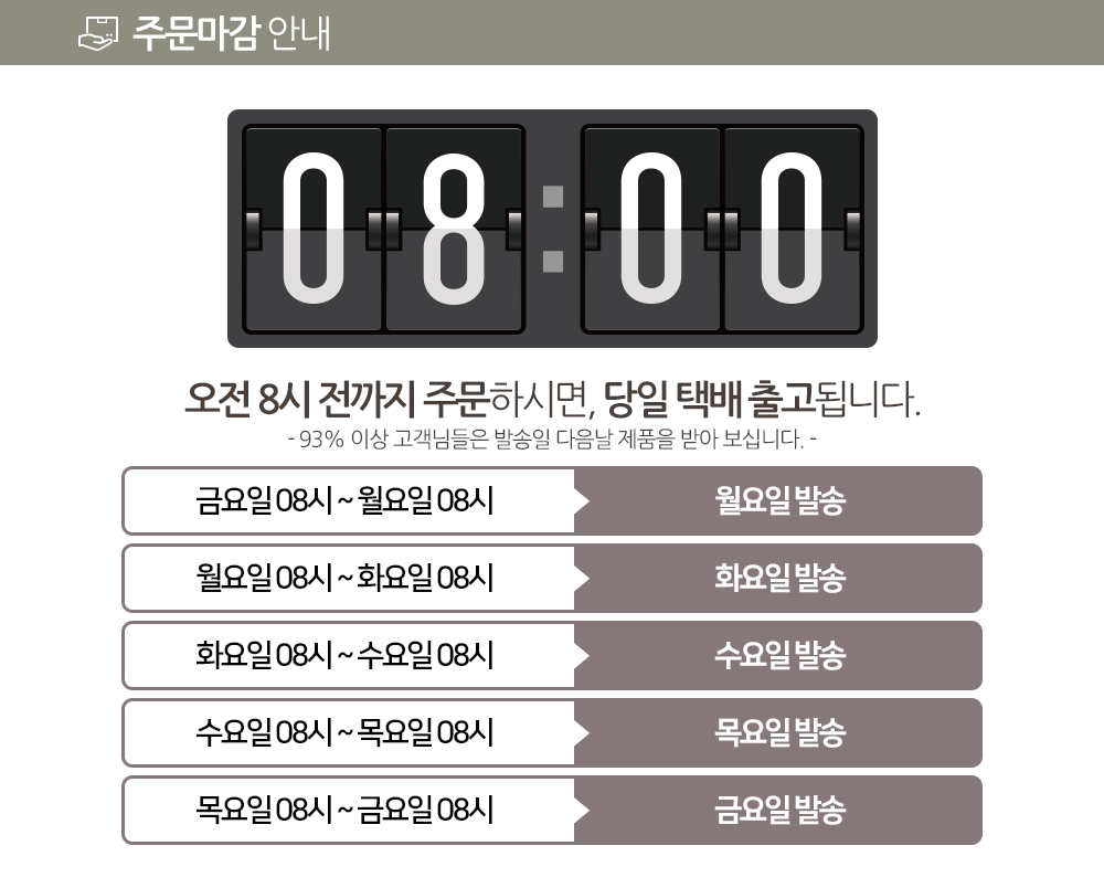 배송예정일은 주문시점(주문순서)에 따른 유동성이 발생하므로 평균 배송일과는 차이가 발생할 수 있습니다.